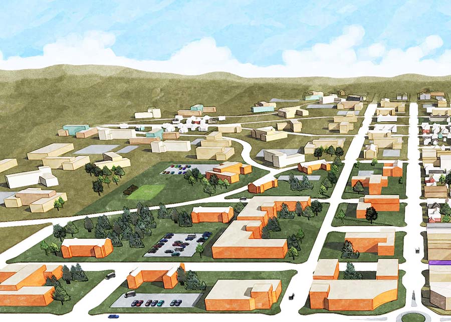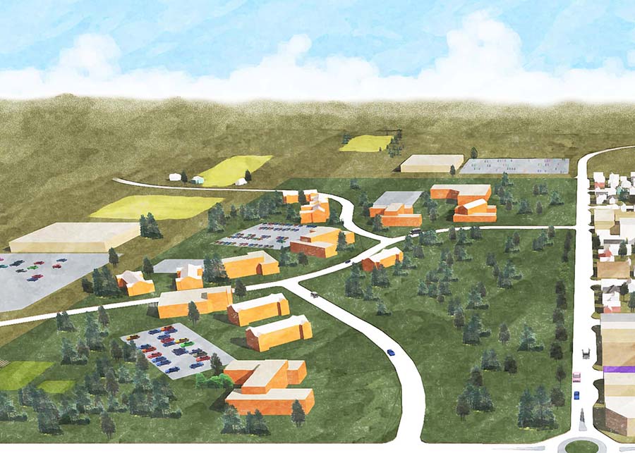 Between 2011 and 2013 the team came created a series of hand-drawn and digital renderings to accompany their extensive site study. The visuals you see here represent a three tiered “town-grown” transition for the campus. The first, “separate” visual depicts the traditional academic enclave, one separate and having little to do with its surrounding community. Next, the “Separate but Connected” campus model is one that blends open spaces on the campus with a closer integration with the surrounding community. Finally, the “Urban-Integrated” campus model is fully immersed into the fabric of the surrounding community becoming more of a district than a campus.